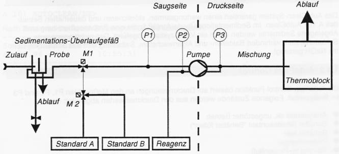 Schlauchpumpe zur kontinuierlichen Förderung von Meßgut (ggf. Standards) und Reagenz. Reagenzdosierung erfolgt über Schlauchdurchmesser und Pumpengeschwindigkeit.