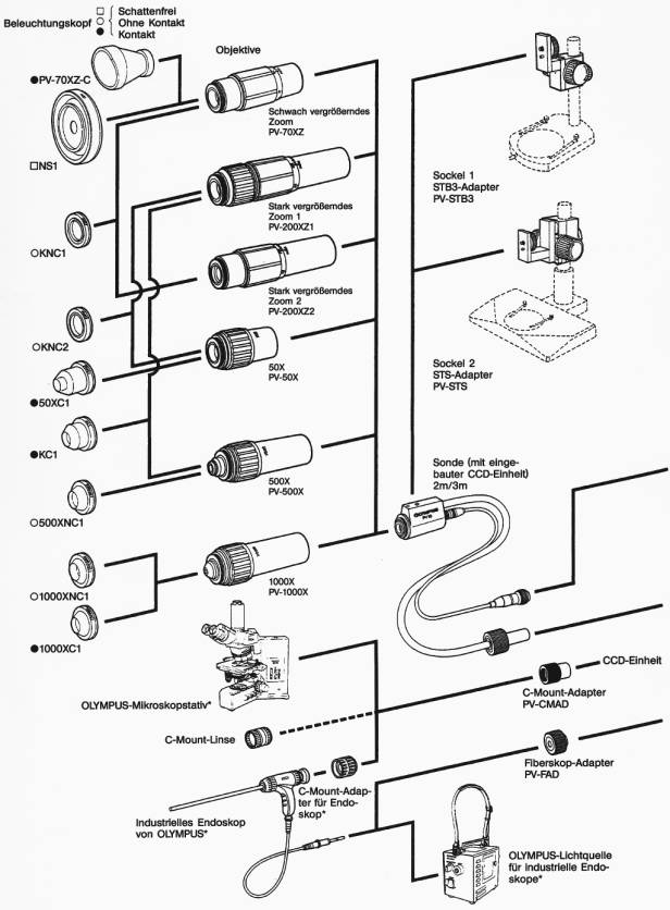 Das PV 10 kann mittels eines Adapters auf verschiedene Beleuchtungssockel für Olympus-Zoom-Stereomikroskope montiert werden. Für mikroskopische Untersuchungen und Dokumentationen läßt es sich außerdem ganz einfach an die Mikroskopstative anschließen.