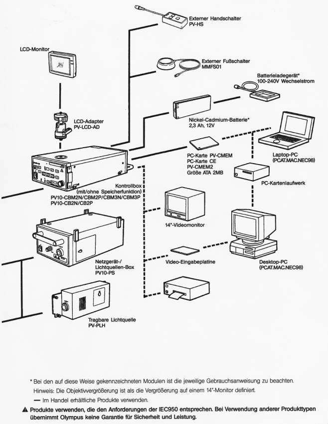 Stationärer Typ 2,9 kg: PV1O-CBM2N 178 (B) x 85 (H) x 369 (T) mm 4,4 kg: PV1O-PS 186 (B) x 131 (H) x 357 (T) mm Tragbarer Typ 4,3 kg + Gewicht des LCD-Monitors/82 (B) x 49 (H) x 255 (T) mm PV1O-CBM2N (Batterie), PV-PLH (tragbare Lichtquelle), LCD-Adapter |