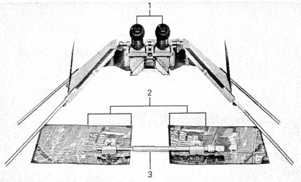 Die äusseren Spiegel sind drehbar am Träger befestigt, so dass sie mit den Beinen zum Verpacken zusammengeklappt werden können. Je eine Schutzklappe (4/3) verhindert das unbeabsichtigte Berühren der Spiegel.