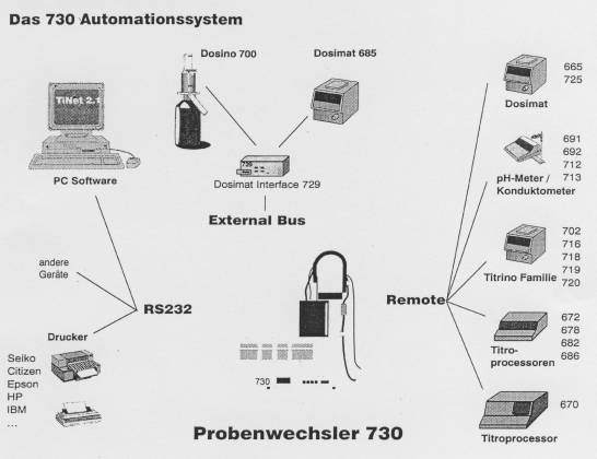 Durch seine weit ausgebauten Kommunikationsmöglichkeiten ar­beitet er über seine parallele Remote- und die serielle RS232- Schnittstelle nicht nur mit der grossen Palette der Metrohm Titrier-, Mess- und Dosiergeräte zusammen, sondern kann mit jeglichen Geräten die über eine geeignete Kommunikationsschnittstelle verfügen, gesteuert werden oder kann diese selbst kontrollieren. Durch diese Fähigkeiten ist er prädestiniert für alle denkbaren Automatisierungsaufgaben in einem modernen Laborbetrieb, selbst innerhalb hochintegrierter Labordatensysteme.