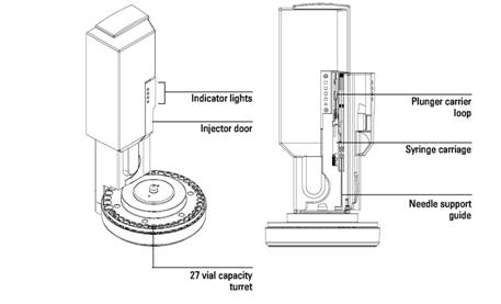 Your 6850 ALS comes with a turret that holds up to 27 2-mL sample vials. Also available is an optional turret holding up to 22 4-mL sample vials. With either turret, the 6850 ALS can use up to two bottles each of two solvent types, and uses three bottles for waste collection.