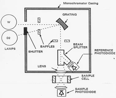 Light from either the Tungsten (W) or Deuterium (Dz) lamp is selected by a shutter, passed through a set of baffles, and dispersed by a concave holographic grating. After passing through a second set of baffles, the light is transmitted to a fiber optic beam Splitter creating reference and sample beams. The reference beam is directed to a photodiode, while the sample beam is focused by a lens, passed through a flowcell, and terminated upon a sample photodiode.
