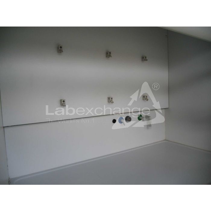 Wesemann Laborabzug. Baujahr 2000. Außenmaße 275x150x93 cm, entspricht DIN 12924 Teil1. Standardunterbau ohne Einlegeböden 400-750m³ Abluftmenge, Frontschieber mit horizontal geteiltem Schiebefenster, Keramiktischplatte ohne Trichterbecken, Beleuchtung, Medien: 2x Strom, 1x Wasser, Druckluft, Stickstoff, 6x Stativbefestigungsmöglichkeiten in der Rückwand.