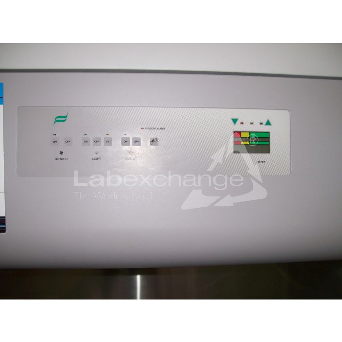 Nuaire Sicherheitswerkbank NU S437-500E. Sicherheitsklasse II. Produkt- und Personenschutz. 230 V. 50 Hz. 8 A. 2x Strom, 1x Gas, brennbar und 1x Gas, nicht brennbar im Arbeitsraum. UV-Lampe. Beleuchtung. Edelstahlarbeitsfläche, nicht segmentiert. Vertikaler Flow. Downflow 38 m/s. Inflow 46 m/s. Außenmaße: 228x167x84 cm. Innenmaße: 72x148x45 cm. Gewicht: 290 kg. Baujahr 2007.