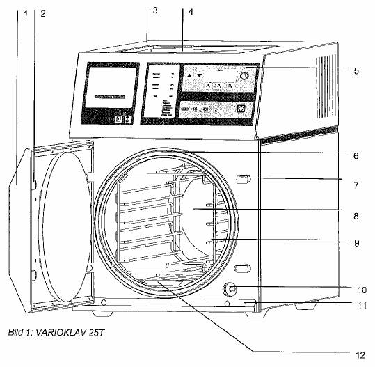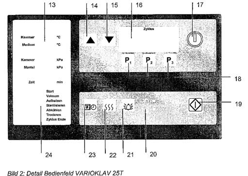 Der Tischsterilisator VARIOKLAV Typ 25T arbeitet mit einer Mikroprozessorsteuerung. Es ist keine Überwachung des Sterilisiervorganges nötig. Das gewünschte Sterilisierprogramm stellen Sie am Bedienfeld (5) ein.