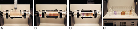 A mixture of naturally colored proteins, including phycocyanin (blue isoforms, pI 4.5–5.0), hemoglobin (red isoforms, pI 7.2 and 7.6), and cytochrome c (orange isoforms, pI 9.5–10.0), was combined with Bio-Lyte ampholytes, pH range 3–10. The sample was injected into the standard (60 ml) focusing chamber (A). The proteins were focused (B) and after 1 hour of focusing (C), the three proteins had been separated. Using the Rotofor system's vacuum-assisted harvesting system, fractions were simultaneously aspirated into 20 individual test tubes (D).