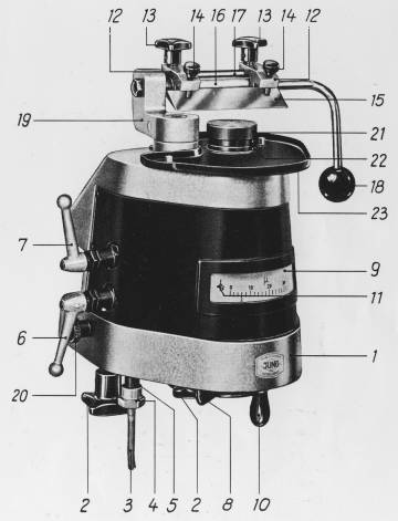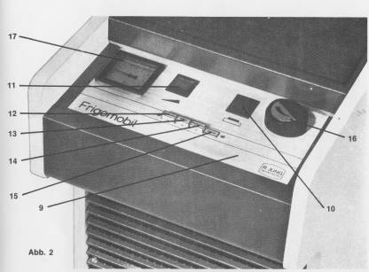 Die Bedienungsplatte (9) ist eloxiert und chemisch wie auch mechanisch sehr widerstandsfähig. Sie nimmt die Anzeige- und alle Bedienungselemente auf. Die beiden Hauptschalter (10 u. 11) sind rot mit den Symbolen für die Objektkühlung (10) und die Messerkühlung (11) gekennzeichnet und leuchten nach Einschaltung. Die Tasten für Vorbereitung" (12), Kühlen" (13), Regelkühlung" (14) und Abtauen" (15) sind beschriftet und werden bei entsprechender Funktion beleuchtet. Der Abtauvorgang wird nur so lange bewirkt, als die Taste (15) niedergedrückt wird. Dadurch ist sichergestellt, daß ein unbeabsichtigtes Überhitzen vermieden bleibt. Rechts auf der Bedienungsplatte (9) ist der Drehknopf (16) mit Regelsymbol zur Temperatureinstellung der Objektgefrierkammer (18). Links auf der Skala (17) wird die jeweilige Temperatur der Objektgefrierkammer (18) angezeigt. Auf der Oberseite des Gerätes können die Arbeitsmittel abgelegt werden.