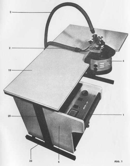 Das Gerät ist mit einem Anschlußkabel und Schuko-Stecker ausgerüstet. Die Kühlschläuche (2 u. 3) bestehen beide aus metallischem Weltrohr und sind zusätzlich zur Isolierung mit Kunststoffschläuchen ummantelt. Das Gerät ist VDE-gerecht hergestellt. Auf dem Typenschild sind Spannung und Frequenz angegeben.
