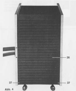 Das Gehäuse (6) besteht seitlich aus Holzplatten, die beiderseits mit Resopal verkleidet sind. Vorn und hinten ist das Gehäuse durch Profilbleche (36) abgeschlossen, die eine gute Luftzirkulation sicherstellen. Das Innere ist als Rahmenkonstruktion ausgeführt. Im Gehäuse (6) lassen sich die zwei Einschubeinheiten, Kühlaggregat für Objektkühlung oben und Kühlaggregat für Messerkühlung unten, leicht und getrennt voneinander ein- und ausbauen, siehe hierzu Abs. 8 der Gebrauchsanweisung.