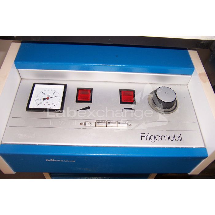 Die fahrbare elektrische Kühleinheit Frigomobil (1) ist zur Kühlung des Objektes an Mikrotouren und zur Kühlung des Mikrotommessers (5) konstruiert. Es findet spezielle Anwendung bei unseren Gefriermikrotomen 1205 und 1206. Die Objektkühlung kann auch für unsere Modelle 1130, 1140, Hn 40, Tetrander sowie für andere Fabrikate verwendet werden. Die entsprechenden Zwischenstücke liefern wir ebenfalls.