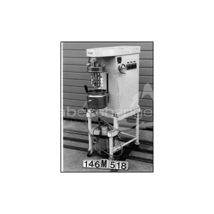 Closed stirring vessel "Vacuum", Brogli+Cie AG, type MH.5.C, no. 1029, new 1969, stainless steel, capacity 6,9 L (usefull 5 L), vessel sizes dia. 210x210 mm, working pressure vacuum, with jacket, working pressure 1 bar, with gate type stirrer with scrapers and helix stirrer, motor, with homogeniser, motor, with switch , mounted on wheels, floorspace 1,0 x 0,6 m, total height 1,5 m