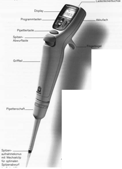 Bei der Transferpette® electronic handelt es sich um eine mikroprozessorgesteuerte, akkubetriebene Kolbenhubpipette nach dem Luftpolsterprinzip zum Pipettieren von wässrigen Lösungen mittlerer Dichte und Viskosität.