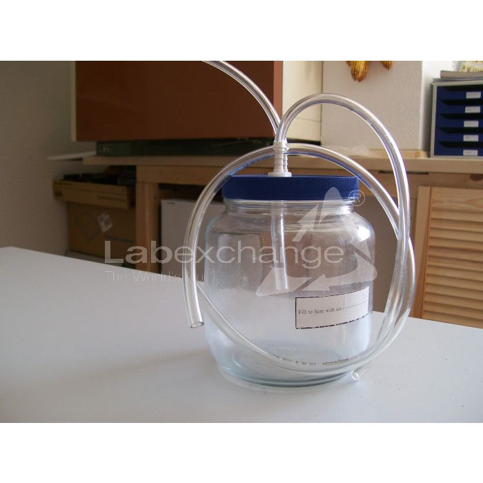 Fisherbrand Condenser. Glasbehälter 17 cm hoch. Plastikdeckel 11cm Durchm. 2 Anschlüsse für Evaporator und Vakuum mit Schlauch. Baujahr 2003.