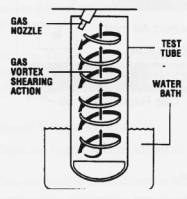 Sample tubes are placed in a rack that sits in a temperature-controlled water bath. The water bath operates over a temperature range of ambient to 900C.
