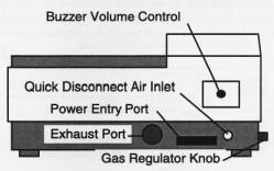 There is a gas regulator knob on the side of the unit and a gauge on the front panel. Use the gas regulator knob to reduce the external gas supply pressure (60 psi to 100 psi) to the 0 to 30 psi desired helical gas flow directed at each of the sample tubes.
