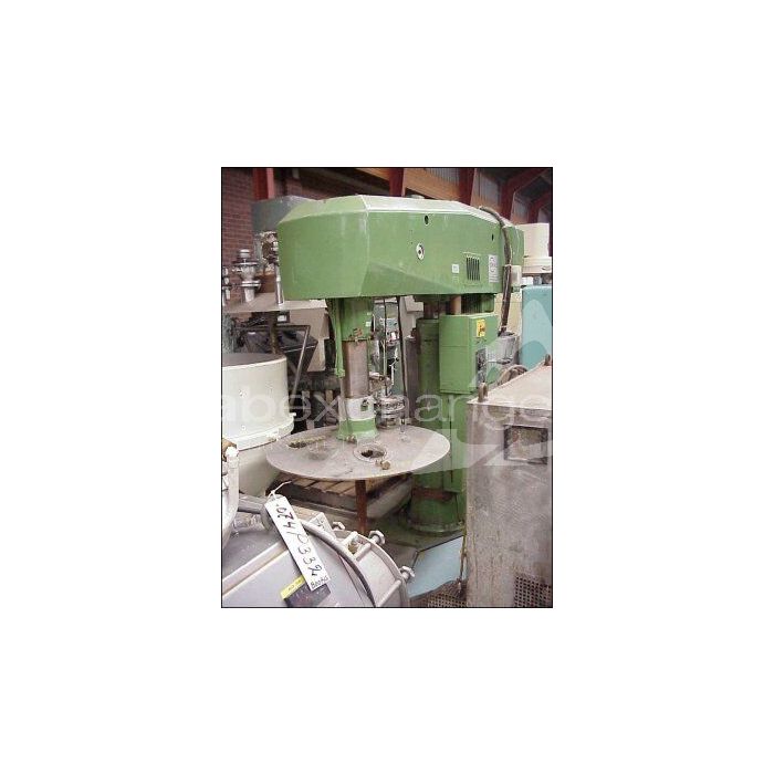 Dissolver Drais, type RSV 14, no. 44245, new 1971, mild steel, shaft length 1150 mm, disc diameter 400 mm, between shaft and frame 850 mm, with cover, motor 10 kW, 380 V, Ex., with variable speed drive, with pan, pan material stainless steel, capacity 700 L, pan sizes dia. 990 x 1000 mm, outlet dia. 100 mm, working pressure vacuum, with hydraulic lifting, with switchgear, floorspace 2,7 x 1,1 m, total height 2,9 m
