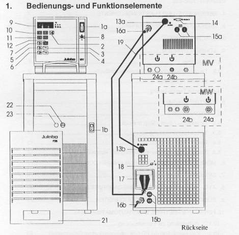 Neben dem Kälteaggregat sind die Haupt-Funktionselemente sind Heizer, Umwälzpumpe und Regelelektronik. Die elektronische PID-Regelung paßt die Wärmezufuhr automatisch dem erforderlichen Bedarf im Bad an.