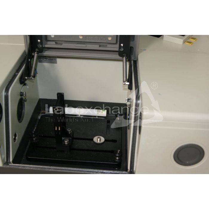 Bruker FTIR-Spektrometer Equinox 55. KBr-Beamspliiter. DTGS Detektor. 230 V. 50/60 Hz. 210 W. CE-Zeichen. Laser mit 635 nm, P0 < 2 mW. Halterung für KBr-Presslinge.