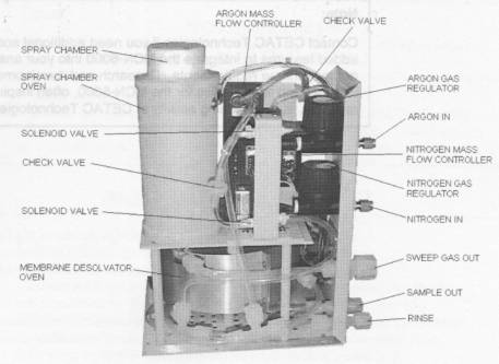 In operation, liquid sample is sprayed into the spray chamber using a microconcentric nebulizer operating at a flow rate of approximately 60µl per minute. The spray chamber is heated to help eliminate water droplets from forming inside the spray chamber. The nebulizer gas flow transports the wet aerosol through the membrane desolvator which preserves the high sample transport efficiency and greatly reduces solvent loading into the ICP, thus alleviating solvent interferences. Solvent vapor is removed through a micro-porous PTFE tubular membrane while analyte continues through the tube and to the plasma. An argon flow (sweep gas) removes the solvent vapor from the exterior of the membrane.