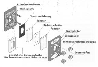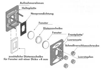 Front- und Halteplatte, Aufnahmerahmen, 4 Schnellverschlussschrauben, Neoprendichtung und 2 Luerstopfen aus Teflon.