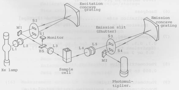 The radiation coming from the Xe lamp is converged at entrance slit S1 of the excitation monochromator through lenses L1 and L2. Only the light dispersed by the excitation concave grating (excitation beam) enters exit slit S2. The excitation beam from exit slit S2 is reflected by concave mirror M1 and the split into two by the beam splitter BS. The one of two excitation beams goes to the monitor detector for its measurement. And, the other beam (most of excitation) passing through BS is converged to the sample cell through lens L3.