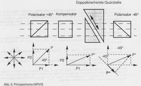 In Abbildung 5 ist das Prinzipschema des Quarzkristall-Keils in NIRVIS dargestellt. Wichtig ist, darauf hinzuweisen, dass durch die spezielle Orientierung der Quarzkristalle im Strahlengang die beiden Teilstrahlen auf exakt demselben Weg durch die Keile hindurchgehen, jedoch ihre individuelle Geschwindigkeit und Polarisation beibehalten.