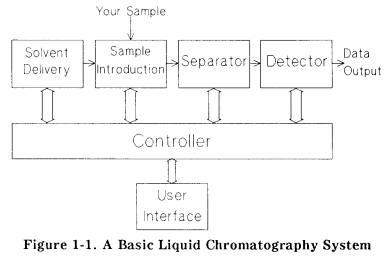 The elements of a basic liquid chromatography (LC) system are shown in Figure 1-1. A liquid sample is taken from a mixture to be analyzed and introduced to a part of the system that is at elevated pressure. The sample is then transported to a separator by the flow in the sytem. In LC, the separator is called the column and consists in most gases of a tube filled with porous material called the stationary phase. A liquid, called the mobile phase, flows through the tube between the particles of stationary phase material.