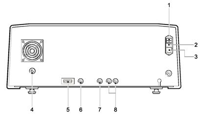 Two LEDs are situated on the front panel (1). The far left LED glows orange to indicate that power is on. The right hand LED will glow green shortly after the instrument is switched on to indicate that the instrument is ready to make a measurement, it will flash red when a measurement is being made.