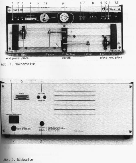 Die Pumpe wird durch einen Schrittmotor angetrieben. Die Flüs­sigkeit wird mit Hilfe zweier Kolben gefördert, die sich in je einem Glaszylinder hin und her bewegen. Die Bewegung der Kol­ben ist so eingerichtet, daß jeweils einer fördert, während der andere neue Flüssigkeit ansaugt. Die Kolben bestehen aus vier Teilen: dem Kopf (piston head), einem Dichtungsring (sealing ring), einer Lochscheibe (plate) und einer Kolben­stange (piston rod) (s. Abb. 2). Die Dichtung kann sehr ein-fach ausgewechselt oder nachgespannt werden.
