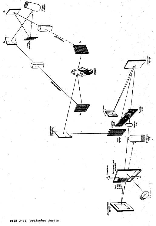In the VIS area of 750 as well as 900 nm until 315 nm, the light of the halogen lamp is reflected by the mirrors S1 and S2 and through which escorts necessary filters for the respective spectral area. In the VIS-area, the ray of light of the D2 lamp is blocked S2 by the lamp change mirror.