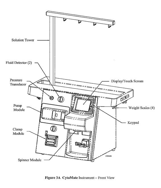 The CytoMate1 instrument, with it's integrated cell washing and fluid transfer capabilities, is a fully automated device designed for washing and coneentrating White blood cell products and fluid transfer applications. This device is designed to be used with the Cell Washer Disposable Set and the Fluid Transfer Disposable Set, as defmed by this Operator's Manual. The Cell Washer Disposable Set incorporates spinning membrane technology for cell washing, eliminating the need for an external centrifuge, which minimizes processing time and Operator intervention. The Fluid Transfer Disposable Set allows for transfer of fluid from multiple sources or single sources into the desired number of bags. The instrument controls a series of pumps, clamps, and weight scales.