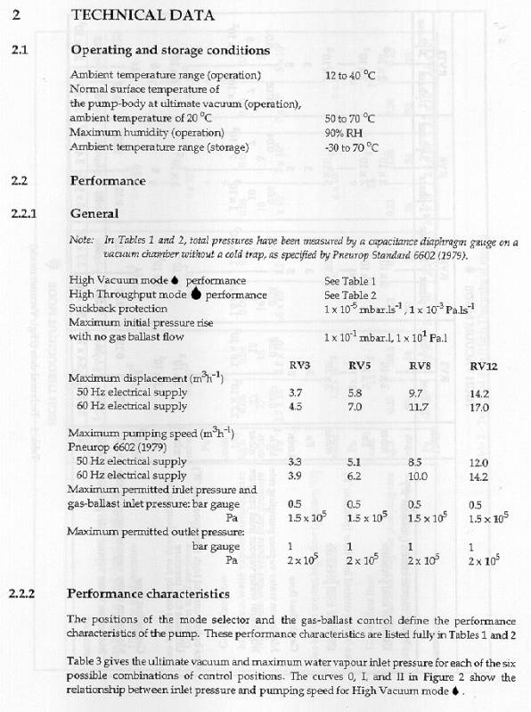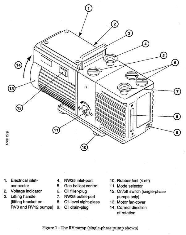 The Edwards RV rotary vane pump is shown in Figure 1. Refer to Figure 1 for item numbers in brackets in the following descriptions. The RV pumps are two-stage, oil-sealed, sliding-vane vacuum pumps. The pump has NW25 inlet (4) and outlet (7) ports, a gas-ballast control (5) and a mode selector (11). When the pump is switched off, an inlet-valve seals the inlet and prevents the suck-back of ai and oil into the vacuum system.