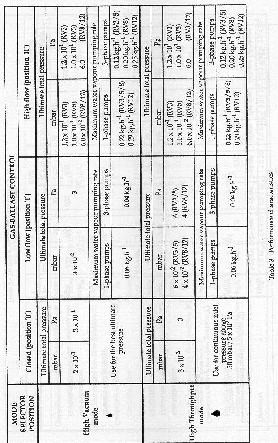 The pump has two controls : the mode selector (11) and the gas-ballast control (5). Six possible combinations of these controls allow for a wide choice of operating characteristics so you can optimize the performance of the puinp for a given application.