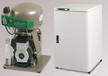Oil-less compressor EKOM of the line DK50 PLUS is the source of clean, presssed, oil-free air designed for driving of dental equipment and devices. With regard to its parameters and capacity of the air tank of 25 litres is suitable for supplying of one dental unit or devices in dental laboratories. Air produced by oil-free compressor provides a higher degree of hygiene and quality of work of the dentist and does not pollute the working environment by heterogeneous substances.