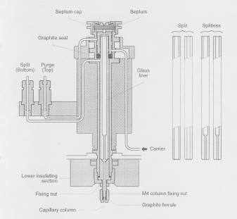 vaporisation chamber through a septum. The injection technique used however will determine the choice of glass liner and length of syringe needle employed (See paragraph 3.4.3).
