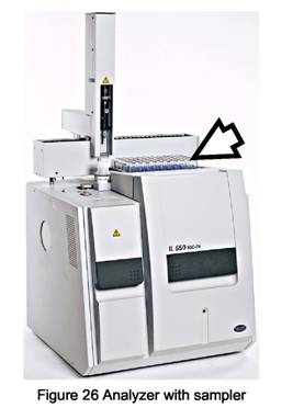 The ASX 60 sampler (Figure 26) is fastened to the basic instrument by means of four hexagon-socket screws. It is suitable for both homogeneous and inhomogeneous particle-containing samples. Each sample can be stirred individually just before the analysis. The stirrer speed can be selected manually. In the NPOC mode, the samples can be automatically acidified.