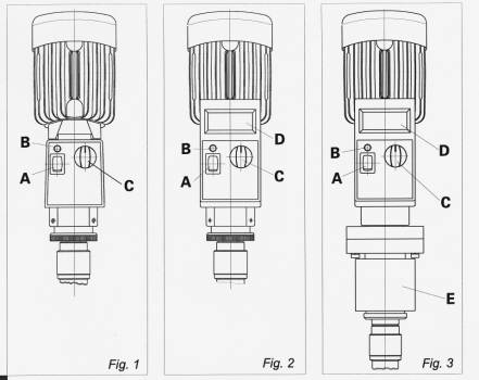 When the self-locking temperature sensor is tripped, the yellow glow lamp (B) on the front plate of the unit lights up to indicate the motor overload and the stoppage of the motor. In this case the unit can only be switched back on after it has been switched off for approx. 4-5 minutes by pressing the rocker switch (A) on the front plate or by disconnecting the mains plug.
