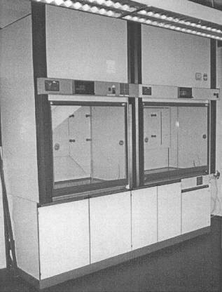 Die Schiebefenster sind aus Verbundsicherheitsglas in voller Höhe mit Querschiebern unter- . teilt und weisen strömungsgünstig geformte, durchlaufende Griffprofile, Edelstahldrahtaufhängung und Fallsicherungen auf. Das Schiebefenster ist zur Tischplatte hin so ausgebildet, daß bei möglichen Unfällen Spritzer, Splitter o. ähnl. um 90° zum Fußboden umgelenkt werden. Das Gegengewicht ist vorne in der Pylone leicht zugänglich untergebracht.