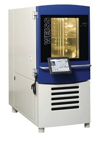 An air stream that is temperature conditioned and/or air conditioned precisely to the entered set values continuously flows through the test space and ensures an optimum spatial distribution of air and temperature with best constancies in terms of temperature and humidity.