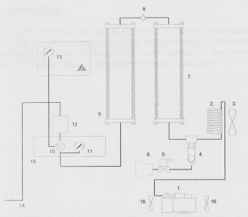 Air is drawn into the System by the compressor (1) and passed via the cooling coil (3) and the filter/separator (4) into the CMS column (7). Oxygen molecules in the air are trapped by the sieve. However, the molecules of nitrogen pass straight through and are collected in the nitrogen storage tank (9). After a time interval, the compressor is stopped and the exhaust valve (5) opens, allowing the sieve column to vent to atmosphere. The trapped oxygen is liberated and escapes to atmosphere via the exhaust valve (5) and the Silencer (6). The generated nitrogen in the storage tank is then regulated to the correct pressure and flow rate. After another time interval, the exhaust valve shuts and the compressor Starts. This cycle runs continuously.