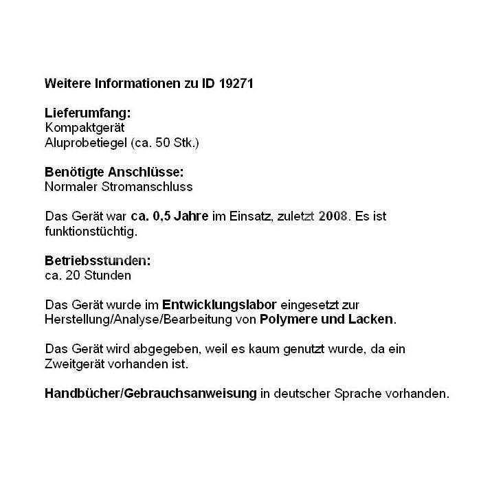 Responsable du contenu de l‘offre d’appareil est la société Labprocure GmbH, comme annonceur. Labprocure assume la responsabilité des offres annoncées ici ainsi que des photos et des textes d’offre inclus. Labprocure GmbH, Bruckstraße 58, 72393 Burladingen. |