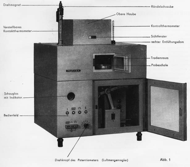 Die magnetisch gedämpfte Präzisionswaage besitzt eine Projektionseinrichtung, durch die die Feuchtigkeitsresultate als Leuchtbild auf einer Mattscheibe erscheinen. Die Temperaturregelung erfolgt automatisch durch ein stromlos gesteuertes Kontakt-Thermometer.