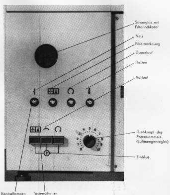 Alle Funktionsvorgänge werden von einem elektronischen, mit Halbleiterelementen bestückten Regelteil, das als Einschub ausgeführt ist, gesteuert. Zur Temperatureinstellung dient ein verstellbares Kontaktthermometer in Verbindung feit einem Kontrollthermometer.
