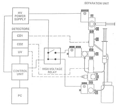 Fig.1. A block diagram of the EA 101 column-coupling capillary electrophoretic analyzer.