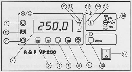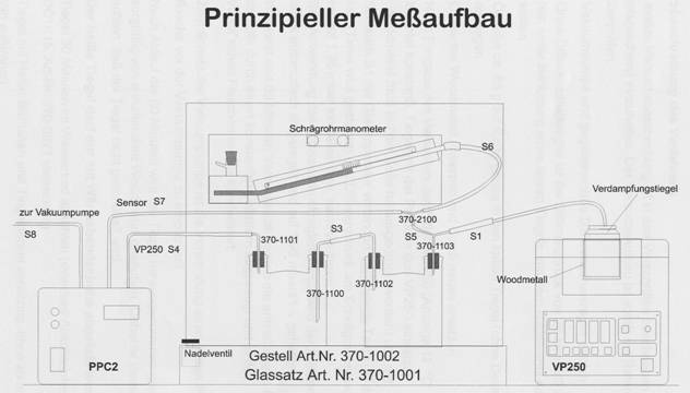 4. Nach Freigabe des Versuches durch den VP250 (Anzeige 12 °C leuchtet konstant), Tiegel mit der Probe in den VP250 einsetzen (Woodmetall muß auf der Seite herausgedrückt werden) und mit Schlauch S1 der Glasapparatur verbinden; gleichzeitig Taste T drükken (Timer wird gestartet) und Differenzdruck am Schrägrohrmanometer auf 1,96 mbar einstellen bzw. nachregulieren.
