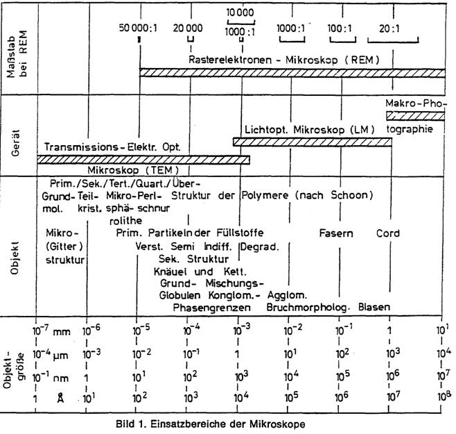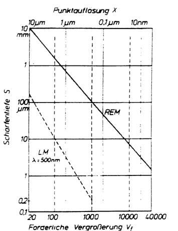 Zusammenhang zwischen Punktauflösung, Schärfentiefe und förderlicher Vergrößerung bei der Abbildung im Lichtmikroskop (LM) und im Rasterelektronenmikroskop (REM).