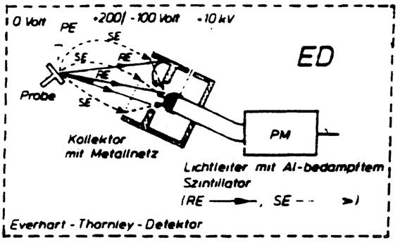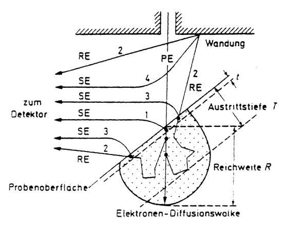 Zur Bewertung der von Primärelektronen ausgelösten Sekundär- und Rückstreuelektronen (schematisch).