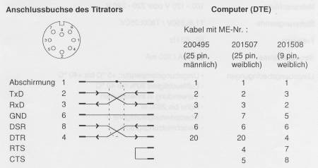Pinbelegung der Buchse am Titrator und der Stecker bzw. Buchsen der zur Verfügung stehenden Kabel: