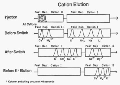 The Fast Sep Cation II is used with the Fast Sep Cation I in the Column Switching Mode to obtain the fastest possible results for the simultaneous analysis of both alkali and alkaline earth metals under isocratic eluant conditions. Figure 3-1 is a representation of the separation scheme.